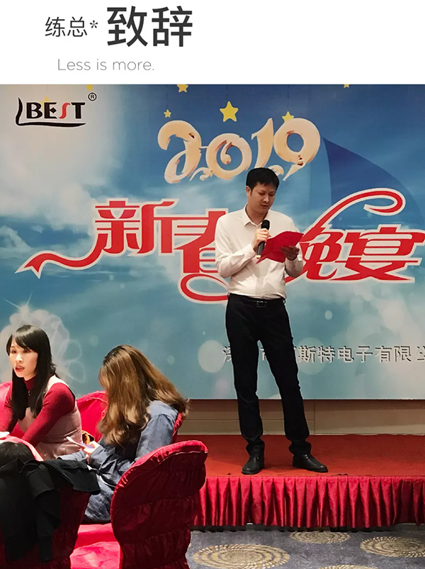 休息后,百斯特電子全員盛裝出席新春晚宴,晚宴在祥和而熱烈的氣氛中開始,首先由公司總經(jīng)理練總致辭,在這辭舊迎新,歡聚一堂的時(shí)刻,練總首先向全體員工致以誠(chéng)摯的祝賀!回首2018,全體員工不辭辛苦,兢兢業(yè)業(yè)。公司的業(yè)務(wù)節(jié)節(jié)高升,取得了有目共睹,可喜可賀的成績(jī)。2019公司將聚焦現(xiàn)有產(chǎn)品,發(fā)展新產(chǎn)品,只要我們滿懷信心,攜手共進(jìn),我們一定能創(chuàng)造一個(gè)更加美好的明天!