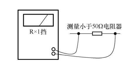 (5)測(cè)量小于50的電阻器。圖5-23是測(cè)量小于50的電阻器的接線示意圖。當(dāng)萬(wàn)用表放置在電阻 r1中,兩根桿連接到電阻器的兩個(gè)引腳中的任何一個(gè)時(shí),表針應(yīng)偏轉(zhuǎn)到右邊,指向電阻器的標(biāo)稱電阻值,如10電阻器,表針應(yīng)停在刻度盤上的10點(diǎn)處。